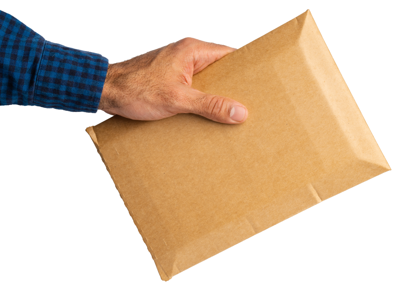 male-hand-holding-parcel-post-against-white-background 1
